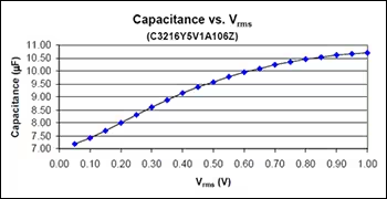 如果將測試儀表的OSC電壓設置為1.0Vrms,不能保證在電容器上施加全部外加電壓。因此,當發現電容器上的電壓約為設定值的10%時,也就不足為奇了(圖3)。該圖顯示了低VAC如何影響測得的電容值。