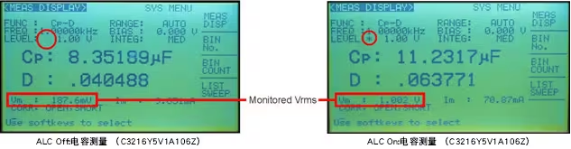 下圖展示了ALC on和off之間的差異。當ALC功能off時,電容器上的實際電壓約為1.0Vrms設定電壓的10%。當ALC功能on時,電容器上的電壓幾乎是設定電壓的100%。HP4284A具有電壓和電流等級監視器,但還是可以使用伏特計驗證實際電壓。